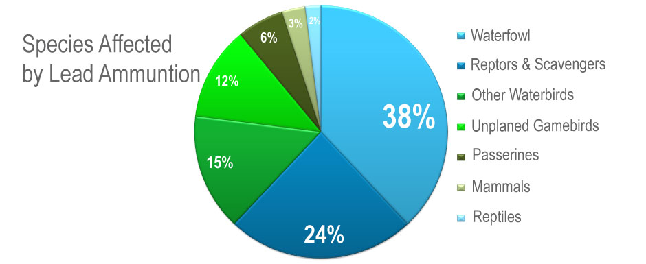 Prior to the introduction of lead free ammunition around 1.6 - 2.4 million (2 to 3 per cent) of the United States' autumn wildfowl population are thought to have died from lead shot ingestion every year, with similar levels recorded in Europe every year. Sadly, birds such as bald eagles, and mammals, such as wolves, coyotes and other predator or scavenger species, feed on the shot or poisoned prey and ingest toxic levels of lead as a result. This causes fatal lead poisoning.Results from the many studies conducted show that lead poisoning is adversely affecting every strata of the food chain, with far-reaching implications for many forms of wildlife, including endangered species. The near extinction of the Condor - a bird native to California, for example, has been partly attributed to poisoning from lead ammunition.